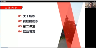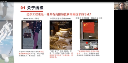 为使2022级新生尽快适应大学生活,树立坚定的专业学习信念,按照学校总体要求,结合最新的疫情防控规定,9月19日上午,纺织工程专业组织2022级新生在腾讯会议上开展了专业教育活动,由纺织工程教研室主任程浩南老师主讲。