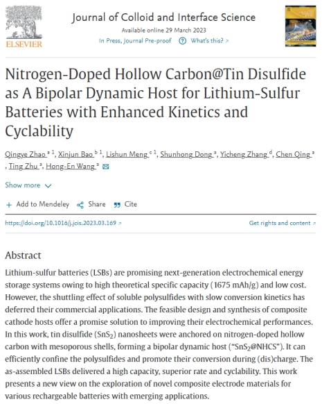 近日,纺织工程教研室包新军博士与云南师范大学王洪恩教授合作,在能源材料领域取得新进展,研究成果以“Nitrogen Doped Hollow Carbon@Tin Disulfide as A Bipolar Dynamic Host for Lithium-Sulfur Batteries with EnhancedKinetics and Cyclability”为题发表在国际期刊《Journal of Colloid and Interface Science》上(DOI:10.1016/j.jcis.2023.03.169)(JCRQ1,中科院SCI一区Top期刊,IF=9.965)。包新军博士为该论文共同第一作者,麻豆官网