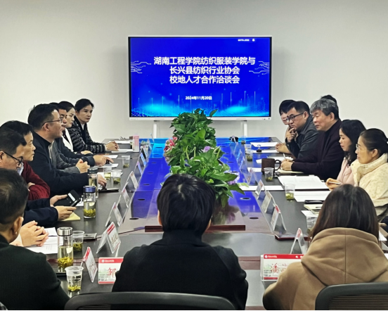 在纺织楼B302会议室举行与浙江省湖州市长兴县纺织行业协会校地人才合作洽谈会。长兴县经信局党委副书记、副局长姚建忠,长兴县纺织行业协会会长、浙江湖州威达集团股份有限公司董事长姚锄强携14名企业负责人前来洽谈。学院党委书记李爱国、副院长陈晓玲、党委副书记何斌及部分师生代表出席会议。会议由何斌主持。