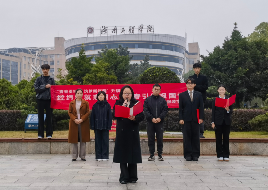 在知行广场隆重举行“经纬织就家国志,青春引线报国情”主题升旗仪式。学院党委副书记赵玲令、全体辅导员、学生党员、学生干部及2025级全体新生共同参加。