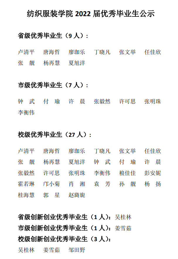 根据学校《关于评选2022届省、市、校级优秀毕业生和创新创业优秀毕业生的通知》的要求和学校优秀毕业生评定办法,经本人申请、班级推荐、班主任审核、学院民主评议,初步评定了麻豆官网 2022届优秀毕业生,现将推荐名单公示如下: