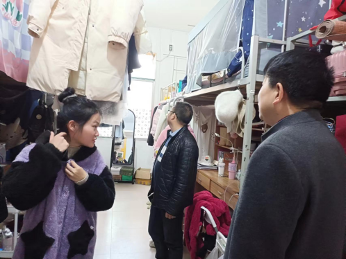 在学生宿舍,周衡书、李爱国检查同学们生活电器的使用情况,提醒同学们自觉遵守宿舍管理规定,提高消防安全意识,及时关闭插座电源。同时注意网络安全,提高“防电诈”意识。每到一间宿舍,周衡书、李爱国为宿舍同学提前送去新年祝福,同学们也祝老师元旦快乐、工作顺利。
