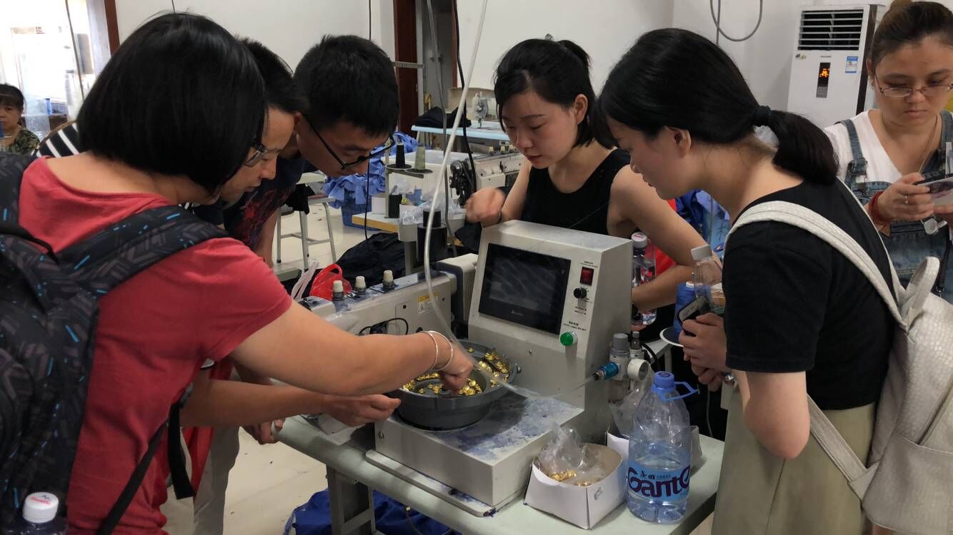 湖南国盛服饰有限公司董事长刘利民首先接待了研究生暑期实践团,他向队员们简要介绍了公司的概况,然后带领大家依次参观了服装生产车间。参观过程中,刘总表示公司近年新引进了一批国内领先的自动化生产设备,显著缩短了工时提高了生产效率,同时最大程度的减少了人为失误造成的服装产量和质量下降。例如,公司原有的普通绘图仪在自动打版排版时耗费大量人力在面料裁剪工序上且精准度不足,但新购入的SINAJET纸板、服装绘图仪则集绘图和面料切割于一体,能够实现智能化、精准化生产。实践团研究生就自动钉扣机与车间技术人员进行了交流,并提出自动钉扣机虽能快速钉扣但牢固程度弱于手工钉扣,如能在设备中加入自动打结功能效果将会更好。