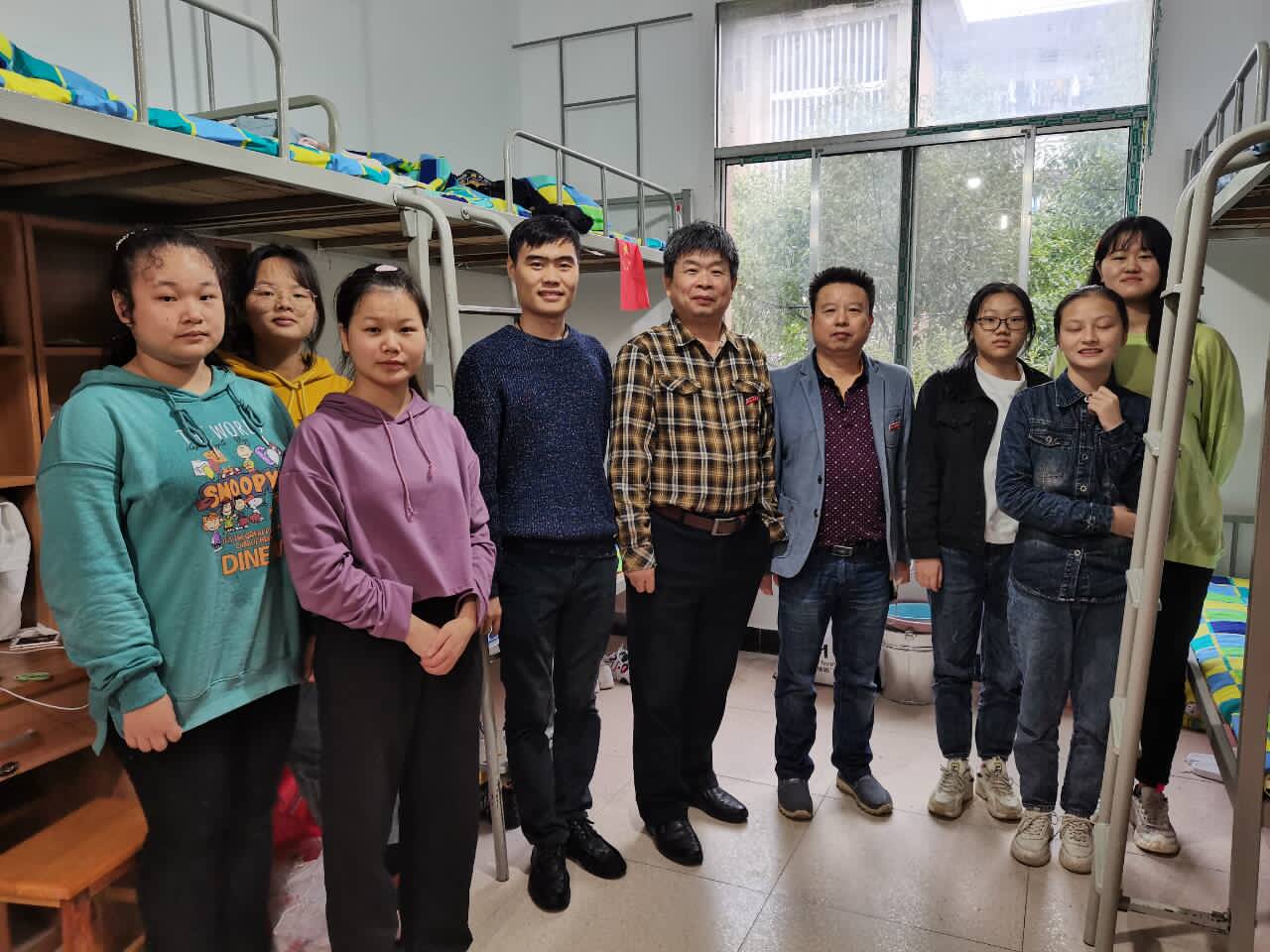 党总支书记李爱国、副院长周衡书、副院陈晓玲、党总支副书记罗荃、副院长何斌以及学办老师来到宿舍关心同学的生活以及报道情况。