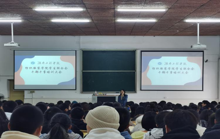 学生联合会主席胡拓宇主持,团总支书记喻亦荣老师发表重要讲话,学生联合会全体成员参加此次会议。
