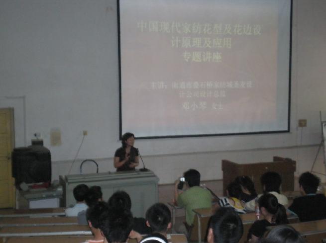 中午13:30,邓小琴女士受邀在电教105开展了一场题为“中国现代家纺花型和花边设计原理及应用”的讲座,听讲者云集电教楼。邓小琴女士作为97届的学姐,亲切而活泼,现场气氛极其融洽。邓女士和学弟学妹们一同分享了她的一些经历,讲到自己作为一个服装设计专业毕业的学生加入到家纺设计这个行业的经历。如今她已经涉足这个行业九年了,自己也已经深深地喜欢上了这个行业。邓女士结合自己9年的经历就有关家纺设计工艺要求、设计元素、花型花边作了详细的介绍。她还提到,目前还没有专门的家纺设计专业,在中国人才市场上具有极大的潜力空间。她表示学弟学妹有这方面意向的都可以找她提供力所能及的帮助。