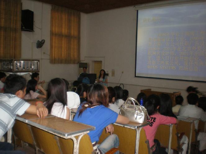 98届优秀校友、现任西班牙AOPOS SYSTEMS市场总监的廖慧玲女士在电教105开展了一场题为“中式元素与欧美主流文化中现代理念的差异”的讲座。院领导、老师、同学都分享了“一个旅行包装载的十年奋斗”的故事,无不被廖女士的自信、美丽所深深打动。“我愿意与大家分享我的创业,我的爱情,分享我美丽的蜕变之旅。”掌声一度如雷鸣。这是一个怎样地自信、美丽的女士啊,她向我们讲述了她的成长经历和创业过程,给我们提出了宝贵的建议。她认为作为一个大学生,在努力掌握科学文化知识的同时,也应让自己走向社会,去尝试工作的压力,让自己的经历、创作带上现实色彩。她给我们展示了许多她珍贵的照片,有法兰西的建筑风情、西班牙的人文风情。“我喜欢带着相机去旅游,这样我能记载下许多生命的片刻。”喜欢看服饰风格,喜欢橱窗设计,喜欢各具特色的建筑,这些都将作为很好的设计题材。