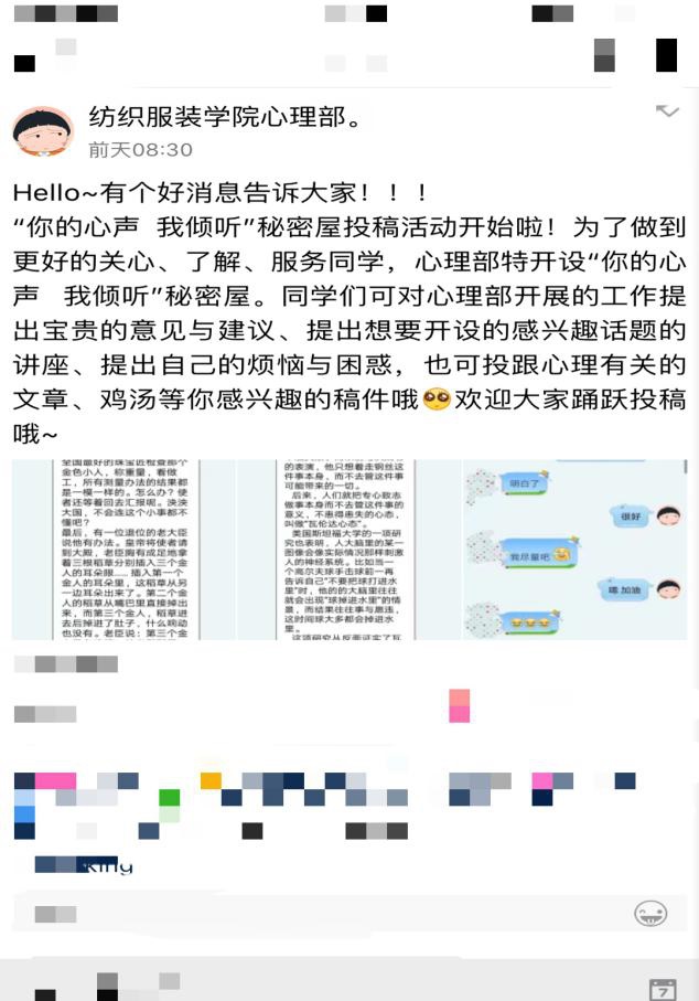展开为期两周的五月特色心理活动“你的心声,我倾听”,在学院心理部全体干事积极宣传与广泛发动下,得到了学院各年级学生的广泛回应与互动,切实帮助一些同学解决了实际问题与困惑。