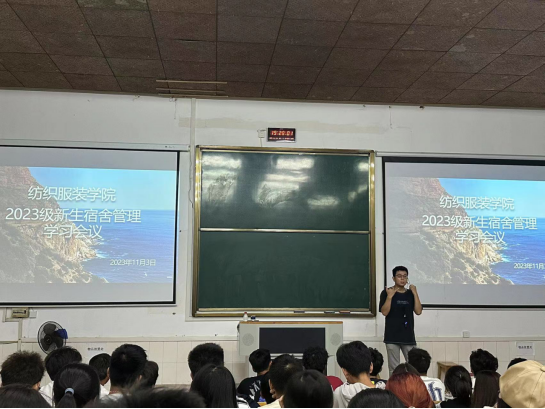 在电教楼105组织全体23级学生分两批次召开宿舍管理讲评会议,会议由辅导员龚旭昱主讲。