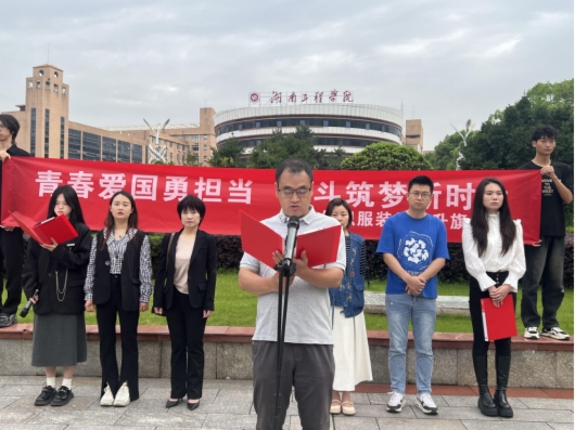 在主校区知行广场举行以“青春爱国勇担当,奋斗筑梦新时代”为主题的升旗仪式。院党委副书记何斌、学生工作办公室全体辅导员、学生党员、学生联合组织干部以及2023 级全体学生参加仪式。