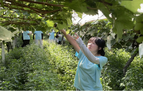 东方红青春“织”约乡村振兴促进团全体师生志愿者走进葡萄种植户龙景玲的田间地头,以直播推广、包装设计、农技实践等多元形式,为小葡萄架起通往大市场的“数字桥梁”,用专业智慧破解乡村振兴中的“甜蜜难题”。