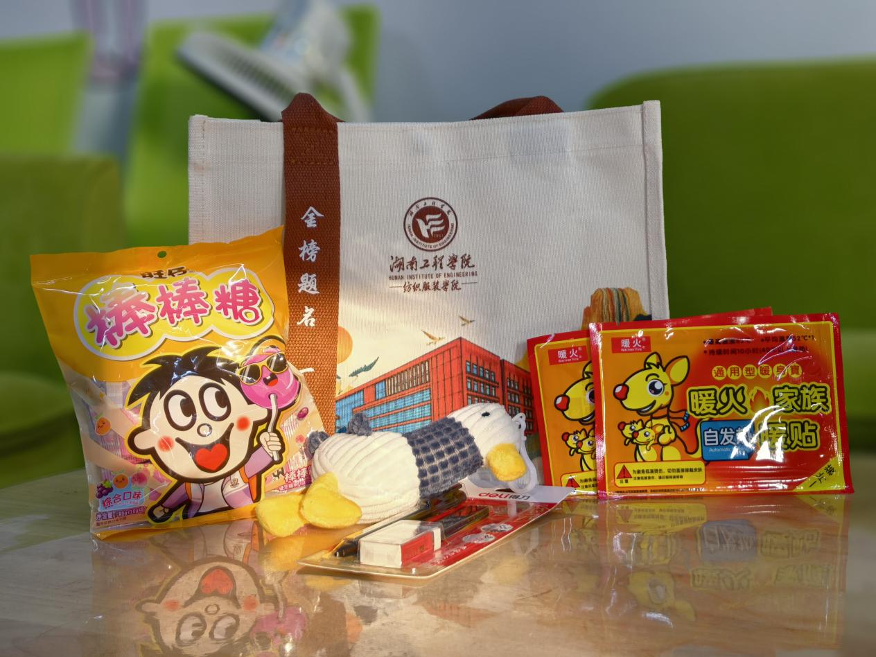 活动中,学院为每位考研同学准备了一份“考研暖心礼包”,将现场氛围推向温暖的高潮。每一样礼物都寄托着学院的殷殷嘱托与美好祝愿:印有纺织楼图案的定制文创袋,寓意“一路陪伴,同心前行”;暖宝宝,传递着“天寒心暖,携手共进”的关怀;旺旺棒棒糖,祝愿同学们“备考顺利,好运相伴”;孔庙祈福2B铅笔,期许“下笔有神,如愿以偿”;可爱的“加油鸭”挂件,则鼓励大家“轻装向前,自信迎考”。这些精心挑选的礼物,不仅是一份物资支持,更是精神上的鼓舞与陪伴。