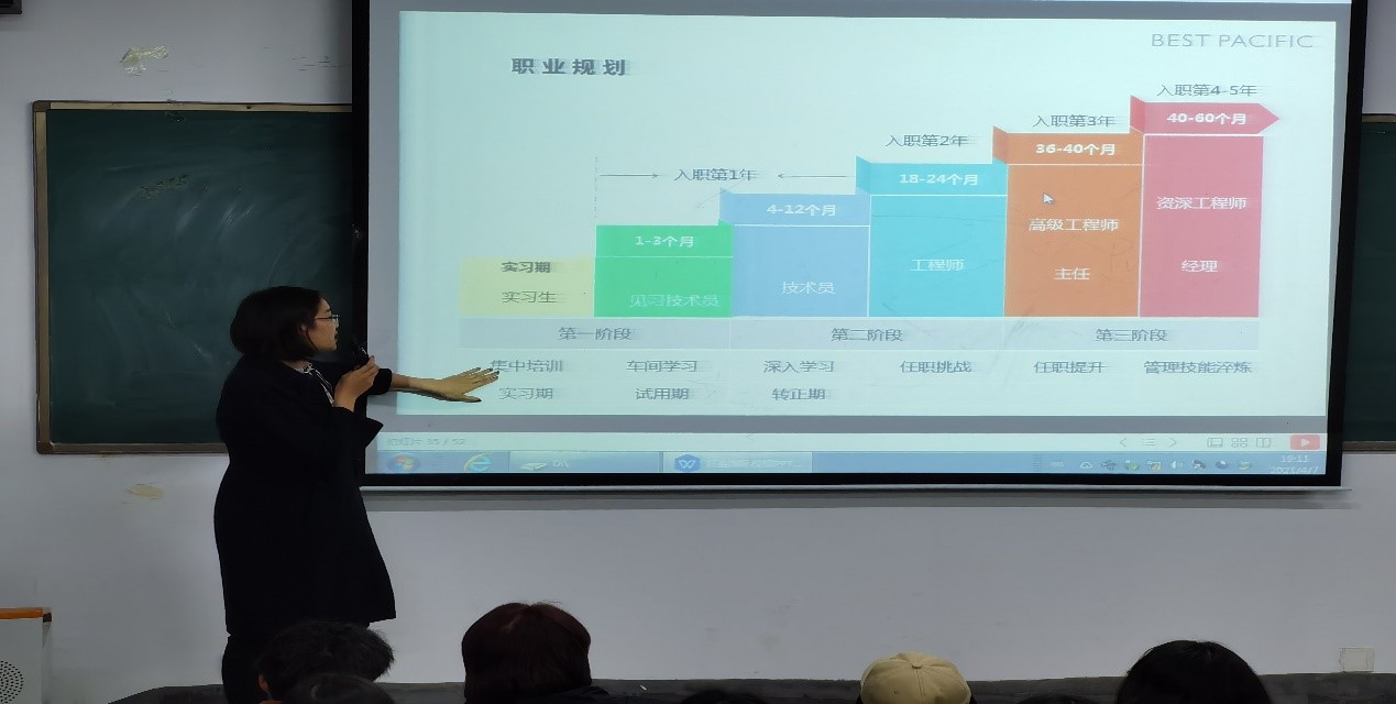 此次招聘会,主讲人详细介绍了公司的各个方面:背景、规模、人才引进计划、发展体系等。同时也说明了日后进入公司后各阶段的班制问题和待遇问题。还向我们展示了公司的主要产品的样品,讲解了公司当初遇到难关的解决方案及成果,让我们更好的了解了公司。