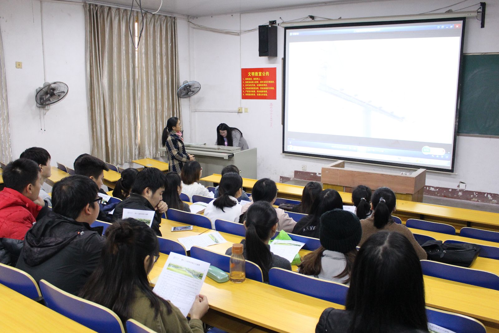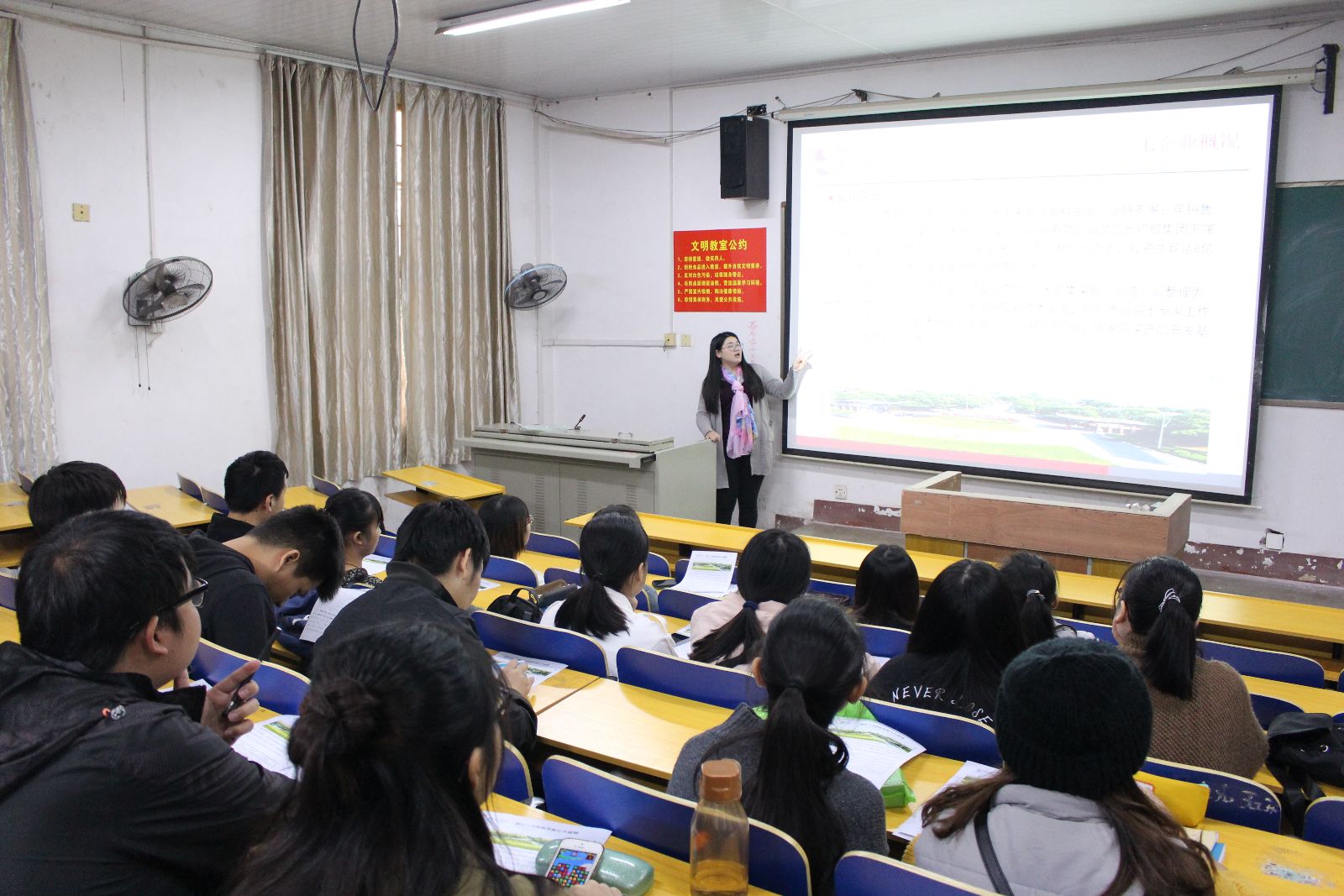 会议初期,主讲人通过视频播放讲述了该公司的区位优势显著,公司拥有先进的生产车间实行环保技术、服装采取优质面料、有多种高新技术整理工艺等,紧接着主讲人向大家介绍了招聘流程以及薪资福利等一系列问题。随后,该公司人力资源部经理讲话,他指出浙江三元纺织有限公司是注重人才和能力的公司,是面向广大人才的公司,并强调公司始终坚持把人才作为资源的理念和人才的重要性。