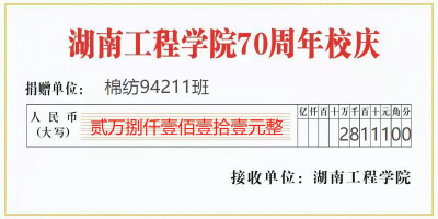 “虽然阔别多年,但棉纺94211班同学们一直心系母校。在得知学校建校70周年的消息后,他们想尽自己一点绵薄之力,贡献班级力量。”班主任刘常威表示。棉94211班的同学们积极响应,筹集捐款。班级同学们也祝贺母校峥嵘岁月如隔日,薪火承续正当时;愿湖工人初心不改图进取,继往开来创辉煌。