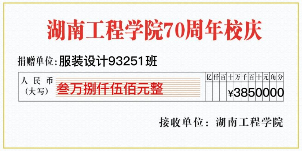 七十年的春风化雨我们一路坚定初心,七十年的春华秋实我们一路守护初心,这一路走来,我们不忘的是校友们的全心全意,不变的是教师们的呕心沥血,不改的是湖工学子们的孜孜不倦。值此母校的七十华诞,服装设计93251班向母校捐赠38500元,助力麻豆官网