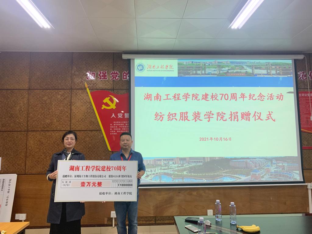 服装93251班校友,深圳海王生物工程股份有限公司湖南区域总裁贺国军为母校捐款一万元,助力纺织服装大楼建设。