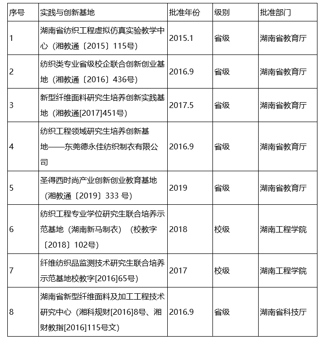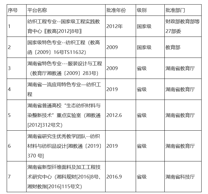 至十三五末,纺织工程学科已先后建立了2个国家级教学平台,9个省级教学平台,2个省级研究生联合培养示范基地,2个省级科研平台,2个校级研究生培养示范基地。十三五期间,本学科新增湖南省工程技术研究中心1个,湖南省研究生优秀教学团队1个,湖南省一流专业1个。