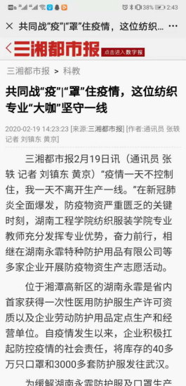 近年来,学院大力弘扬“一丝不苟、精益求精、勇于创新、追求卓越”的工匠精神,营造“做专、做精、做细、做实”的干事氛围,充分发挥优秀技能人才在各领域创造和实现个人及集体价值。在疫情期间,涌现了“疫情一天不控制住,我一天不离开生产一线”的纺织大咖:杨梅老师和汪泽幸老师;服装与服饰设计教研室获湘潭市三八红旗岗等多项个人及集体典型。