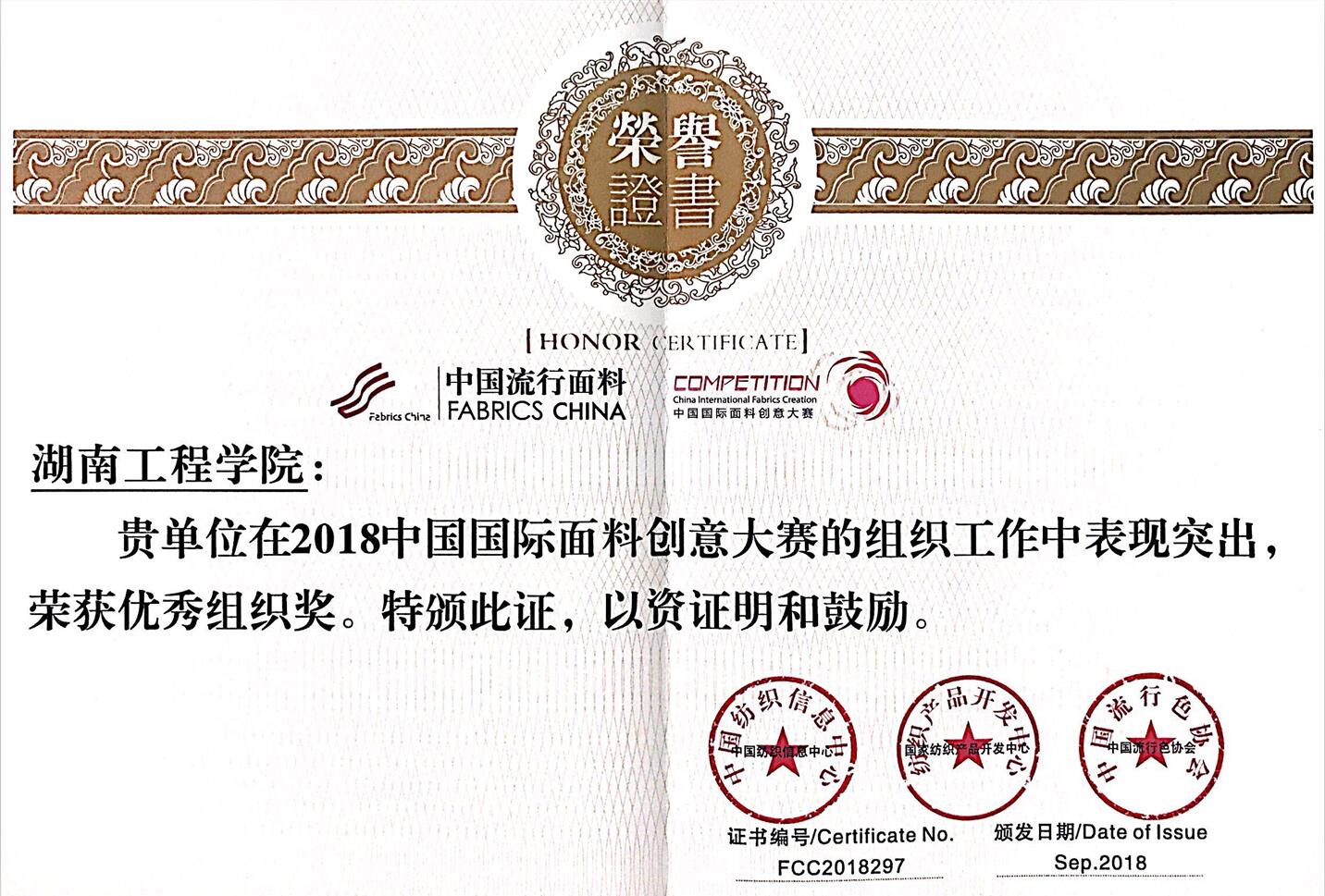 学校荣获2018中国国际面料创意大赛“优秀组织奖” 荣誉