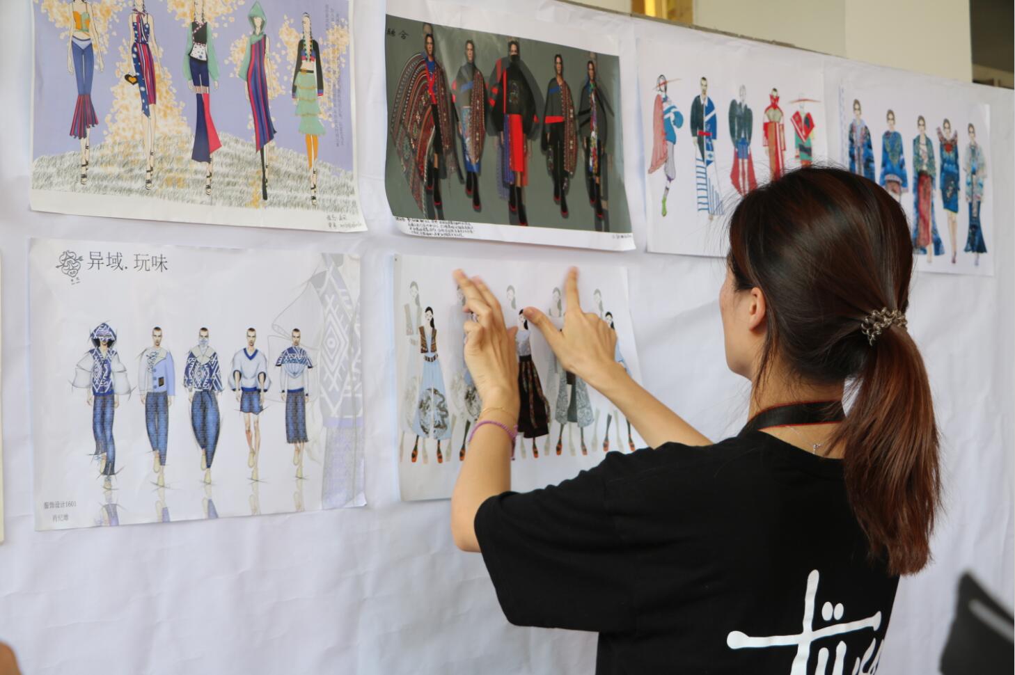 服装与服饰设计专业2016级学子于北校区红楼前筹备民族服饰考察与写生作品展。学生们顶着炎炎烈日将近200幅风景与人物速写、民族服饰设计效果图、摄影照片等实践教学环节作业一一装裱、陈列。据悉,本次作品展出的所有作品均是学生们赴云南进行《民族服饰考察与写生》实践学习的课程作业。该实践教学环节旨在让学生们通过实地考察、走访少数民族居住集聚地区,深入了解各少数民族的服饰风格特点,学习服饰历史文化,感受民族服饰物质与非物质遗产精神,积淀服装与服饰设计创作底蕴,同时为以后的设计活动搜集真实、丰富的原始创作素材。