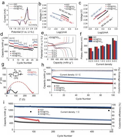 多硫化物(LiPSs)的穿梭效应和缓慢的转化动力学导致锂硫电池(LSBs)的循环性能差和能量效率低。在这项工作中,通过表面活性剂导向的水热生长,在多巴胺保护的热解下合成了一种分层结构的纳米复合材料,作为LSB的双向催化剂。该纳米复合材料由N掺杂的还原氧化石墨烯(rGO)纳米片通过界面N-Ti和C-Ti键固定在均匀分布的TiO2-x纳米颗粒上,从而形成丰富的2D/0D肖特基异质结(rGO/TiO2-x)。密度泛函理论(DFT)计算和原位拉曼表征表明,rGO/TiO2-x有效抑制了LiPSs的穿梭,增强了氧化还原动力学,实现了硫阴极的高利用率,提高了电池的整体可逆性。在高硫负荷和低电解质/硫比下获得高面积容量。在电流密度为0.2C (1C = 1675 mA· g−1)时,初始比容量达到1010 mA h·g−1,在100次循环中,比容量保留率达到86.4 %。