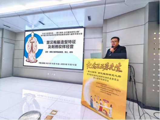 10 月 10 日下午第二场大会发言中,夏添副教授以《楚汉袍服造型特征及刺绣纹样经营》为题分享成果。报告依托荆楚地区楚汉墓葬出土服装实物,梳理文物裁剪工艺与刺绣纹样细节,探讨楚袍 “斜拼” 裁片礼仪功能、袖片刺绣 “倒置” 文化内涵,及楚汉袍服下裳造型差异与礼仪行为变迁的关联,提出 “服饰形态嬗变受礼仪活动中身体行为影响”的观点,获与会专家关注与认可。