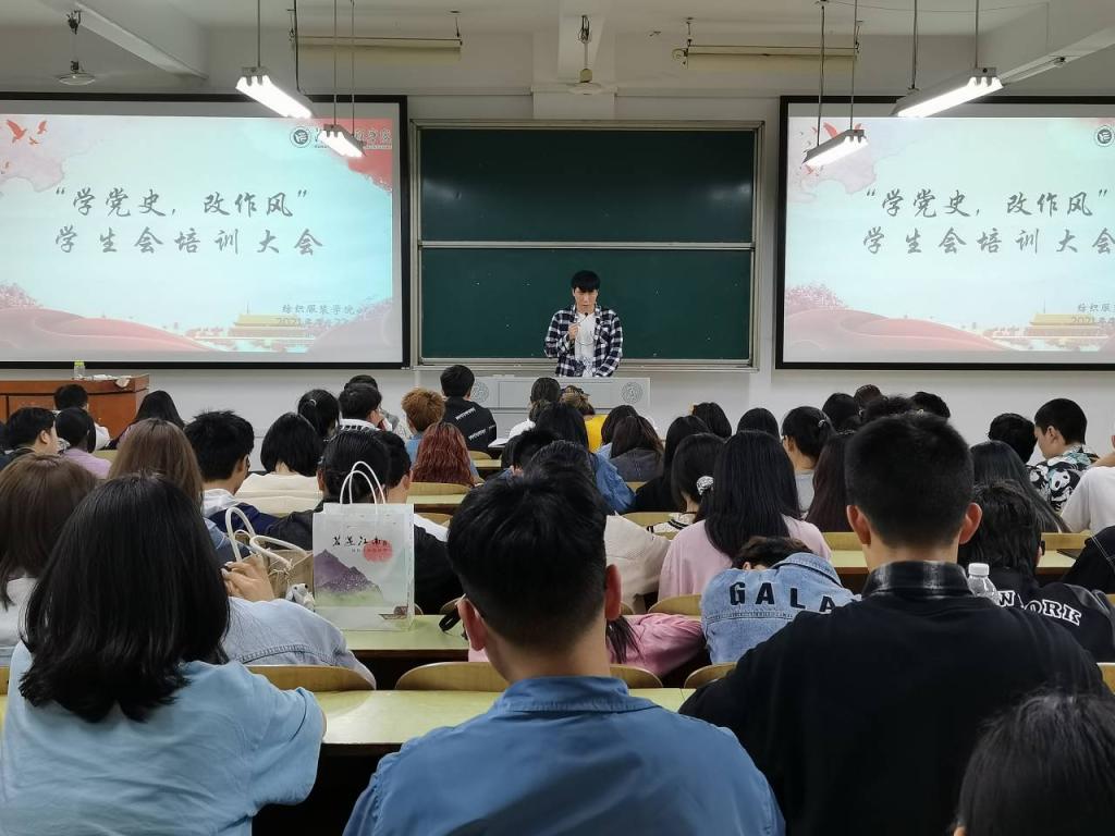 于4月22日晚7:00在新校区D栋203召开“学党史、改作风”学生会培训大会。此次会议由学院团总支书记喻亦荣主持,团总支学生会主席团及全体学生会工作人员出席本次培训大会,对党史以及《关于学联学生会工作人员改进作风服务同学的若干规定》及其相关文件内容进行深度学习。
