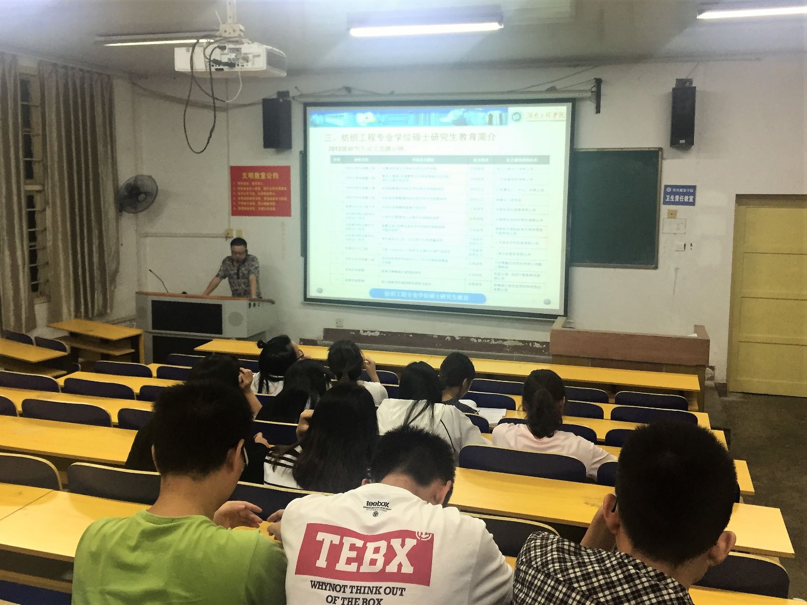 研究生的难易程度,为在场考研的同学报考院校又增加了一条有利选择。随后,周衡书指出:“在社会不断发展的今天,纺织产业改造升级需要大量高层次工程应用型人才”。他要求同学们在提高了自身能力的基础上也要满足社会服务需求。接着他向大家介绍关于纺织工程专业学位硕士研究生教育和纺织工程专业领域校内已有实践基地。纺织工程专业拥有优秀的就业发展前景,同学们不仅可以通过考研多种选择来增加就业的机会,而且学校将成选拔品学兼优得硕士毕业生留校工作 。