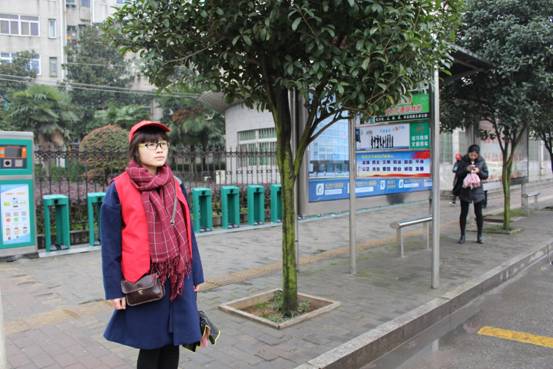 志愿者在北院校门口以及任务教室周边开展巡逻,对人行道、公交站等地进行文明出行引导。