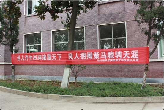 团总支学生会女生部开展了继趣味运动会后又一大赛事——横幅大赛。3月14日,以班级,部门,寝室为单位的参赛的作品均在北院展出,富有创意而又不失幽默的标语吸引了来来往往的师生,将女生节气氛推向高潮。