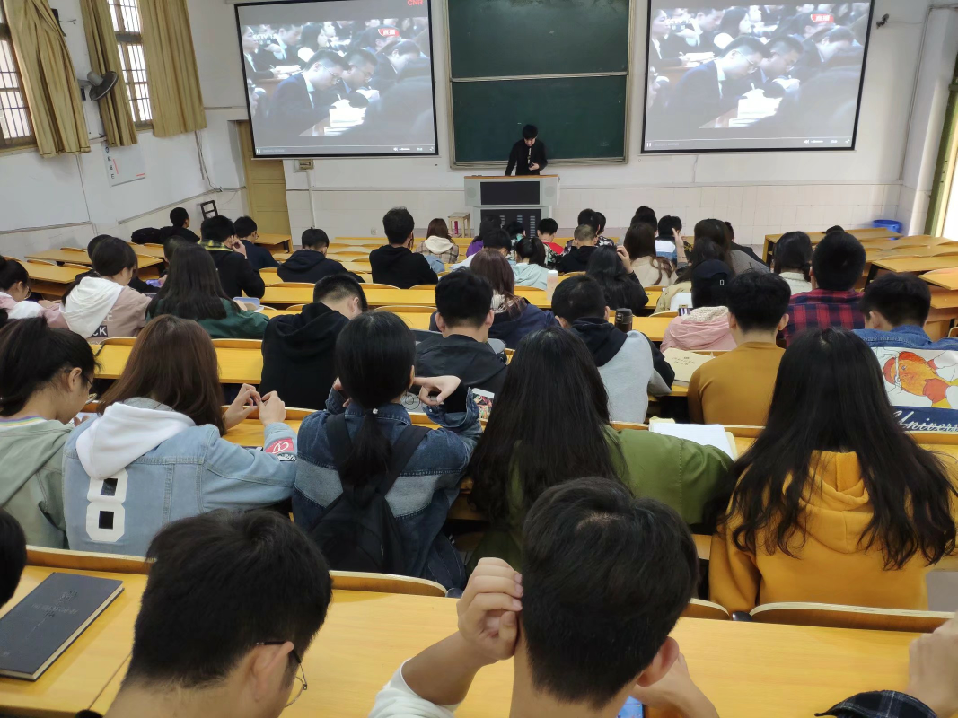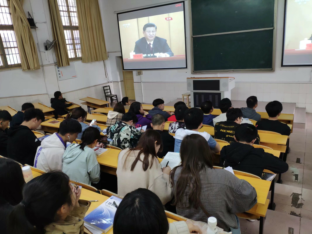 学生办公室主任唐星星、学办老师章平老师和团总支副书记刘阳熙以及纺织工程1801班、1802班同学在电教105观看纪念五四运动100周年大会直播。