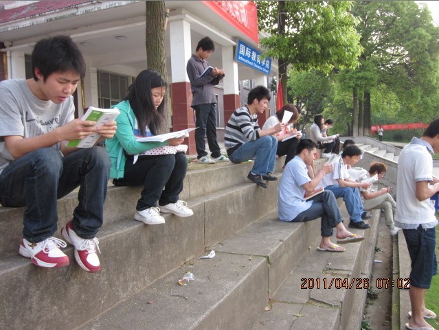 在英语四六级考试渐成必要的今天,伴随公务员与研究生考试的升温,湖工的学习氛围也越来越浓。每天还未到早签到时间,红楼前面就已经有一群朝气蓬勃的青年男女在大声诵读着英语,他们的朗朗专注为这清晨宁静的校园注入了一抹亮色,其中不少就是来自纺工0902班的学生。