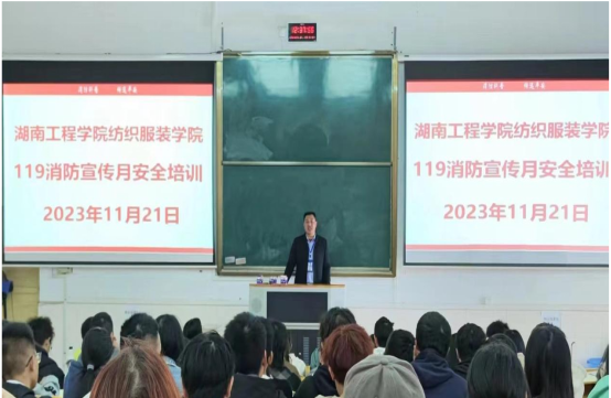 邀请家顺安消防公益服务中心吴悔主任在电教楼105室开展消防安全讲座,学院师生代表150余人参加活动,辅导员龚旭昱主持本次讲座。