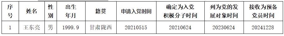 委员会发展党员工作实施细则》的规定,经本人申请、党支部征求意见、支部委员会审查并报学院党委审查,拟将王东亮同志转为正式党员。现将有关情况公示如下: